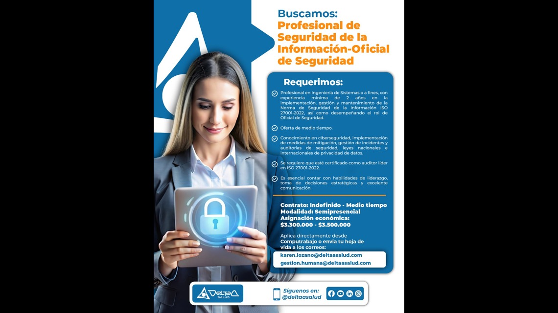 Requerimos para nuestro equipo de trabajo, profesional en Ingeniería de Sistemas o a fines, con experiencia mínima de 2 años en la implementación, gestión y mantenimiento de la Norma de Seguridad de la Información ISO 27001-2022, así como desempeñando el rol de Oficial de Seguridad. Oferta de medio tiempo. Conocimiento en ciberseguridad, implementación de medidas de mitigación, gestión de incidentes y auditorías de seguridad, leyes nacionales e internacionales de privacidad de datos. Se requiere que esté certificado como auditor líder en ISO 27001-2022, preferiblemente con certificaciones en normas como CISSP (Certified Information Systems Security Professional), CISM Certified Information Security Manager , CISA (Certified Information Systems Auditor), ISO 27001 Lead Implementer o Lead Auditor. Es esencial contar con habilidades de liderazgo, toma de decisiones estratégicas y excelente comunicación, procesos formativos, resolución de problemas, respuesta rápida y fomento de una cultura de ciberseguridad.
