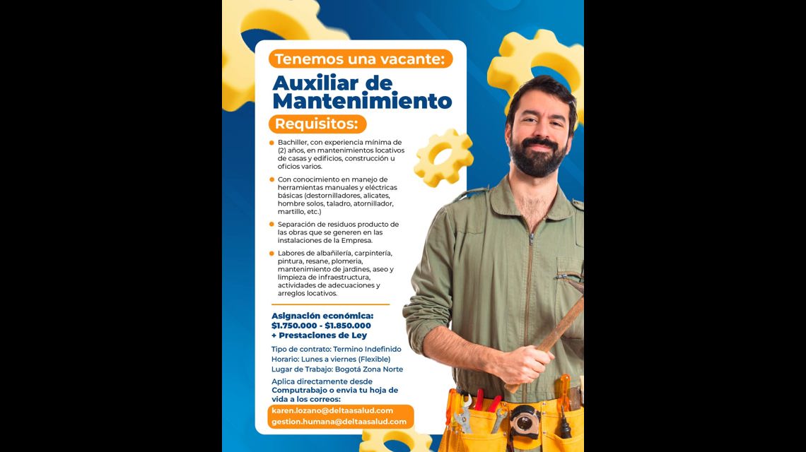 Importante empresa de Auditoría y Consultoría en el sector salud requiere un AUXILIAR DE MANTENIMIENTO para su equipo de trabajo.